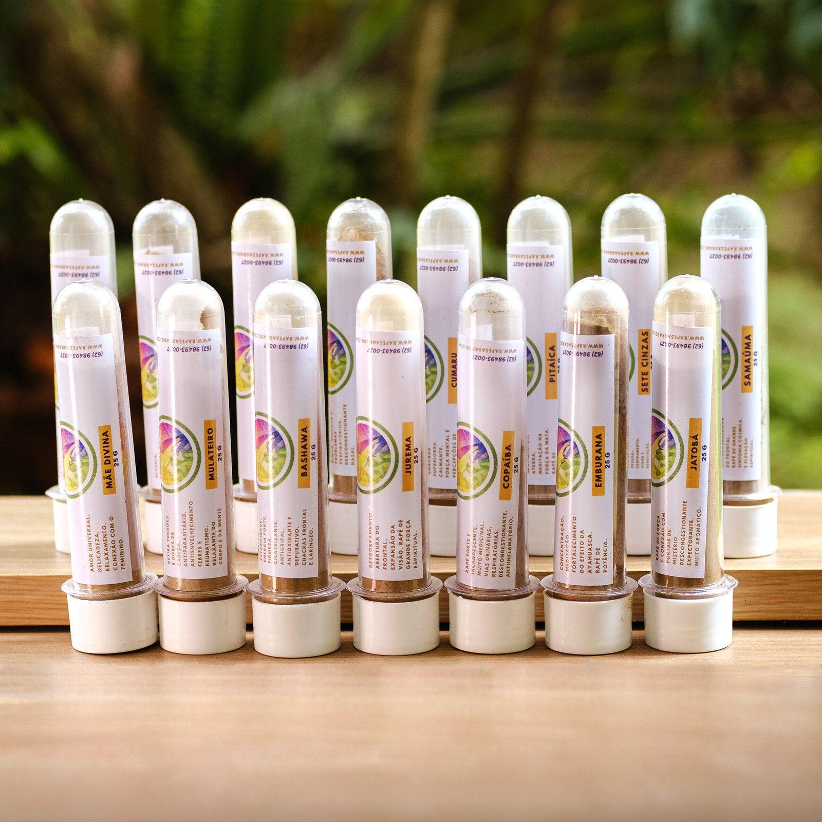 Kit composto por 15 rapés. Samaúma, Canela de Velho, Murici, Tsunu, Mentolado, Cumaru, Pitaíca, Emburana, Sete Cinzas, Mãe Divina, Mulateiro, Bashawa, Jurema, Copaíba e Jatobá.